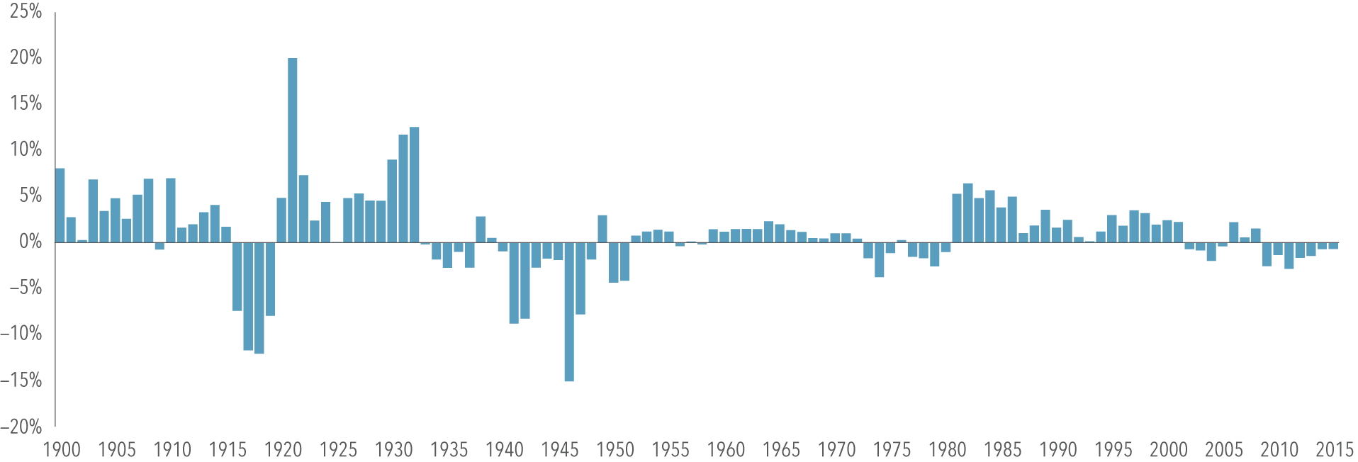 Exhibit 1 shows the annual real returns on one-month US Treasury bills. From 2009 to 2015, the annual real return was negative. This circumstance is not unprecedented. Since 1900, the US has had negative real returns in over a third of those years. And negative real returns on government bills are not exclusive to the US. All countries listed in Exhibit 2 have had negative real returns on their respective government bills in at least one out of every five years from 1900 to 2015.