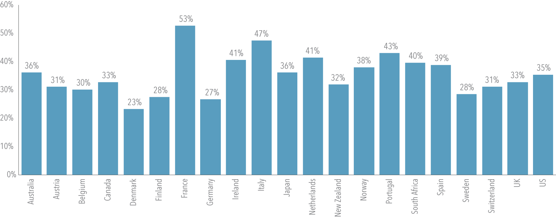 Exhibit 2. Percent of Years with Negative Real Returns on Government Bills, 1900-2015