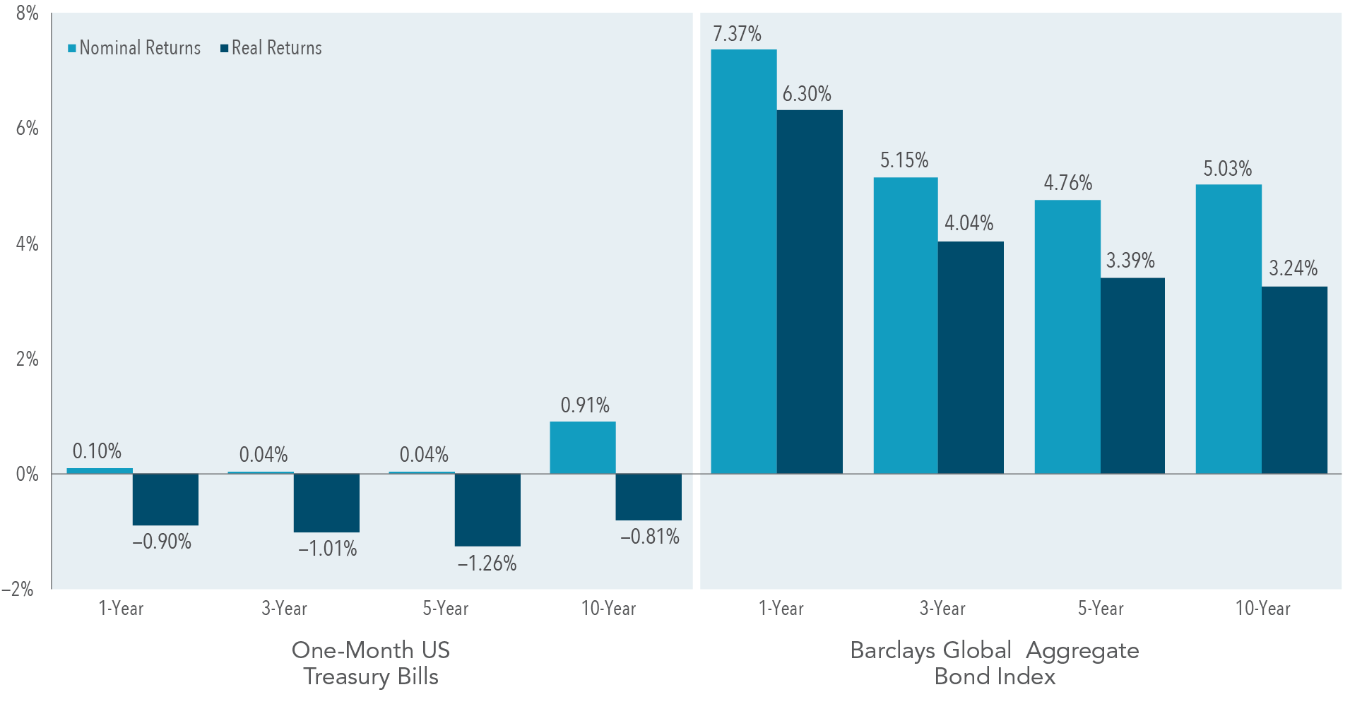 Past performance is not a guarantee of future results. Indices are not available for direct investment; therefore, their performance does not reflect the expenses associated with the management of an actual portfolio. Trailing returns are as of June 2016. The Barclays Global Aggregate Bond Index is hedged to USD. Real Return = [(1 + Nominal Return)/(1 + Inflation)] − 1. Sources: Barclays, Morningstar. Barclays indices copyright Barclays 2016.