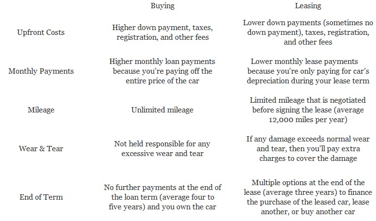 Leasing is just like renting; you pay each month to use the vehicle and do not own the car at the end of the contract. You’re obligated to fulfill your entire lease unless you’re willing to fork over a hefty early termination fee. Plus, you’re still required to perform necessary upkeep to the vehicle such as oil changes. These maintenance fees will usually be minimal during the length of your lease and most cars are still under warranties that cover major repairs. In addition to regular upkeep, you’re also held responsible for excessive wear and tear. At the end of your lease, if the dealership finds any damages that are more than normal wear, then you are responsible to pay extra charges.